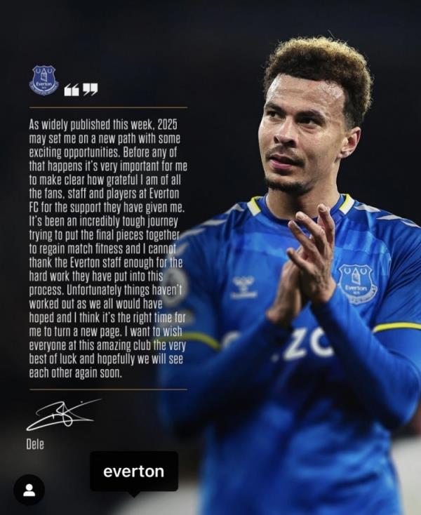 阿里寫道:“正如本周大家廣泛談?wù)摰哪菢樱?025年我可能會(huì)走上一條新的道路,因?yàn)橛幸恍┝钊烁械脚d奮的的機(jī)會(huì)。在這一切發(fā)生之前,我必須要先明確的表達(dá)一下我對(duì)于所有球迷的感激之情,以及埃弗頓所有工作人員以及球員對(duì)我的支持。